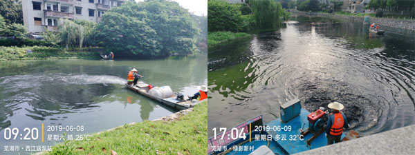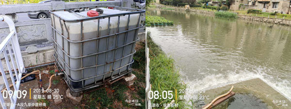 保興垾水域主河道和各支流實(shí)施方式和實(shí)施劑量均不相同,現(xiàn)場(chǎng)實(shí)施時(shí),技術(shù)部門(mén)依據(jù)每日現(xiàn)場(chǎng)巡查結(jié)果和水質(zhì)自檢數(shù)據(jù),實(shí)時(shí)調(diào)整實(shí)施方式和實(shí)施劑量,力求達(dá)到最佳治理效果。