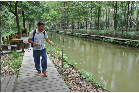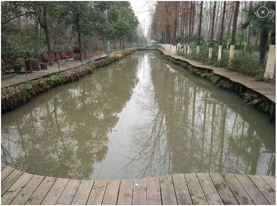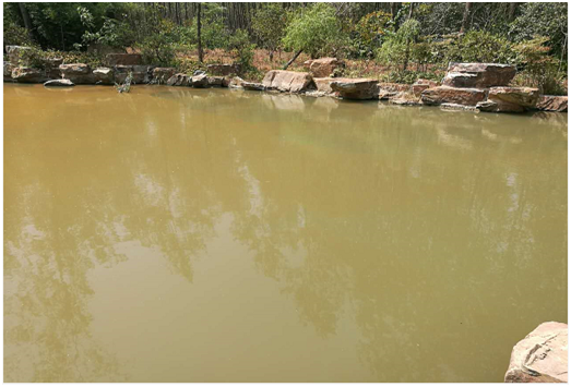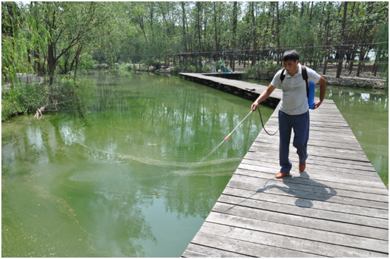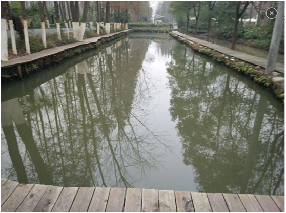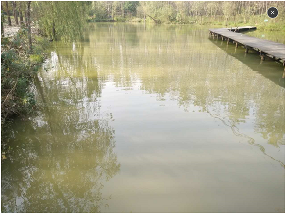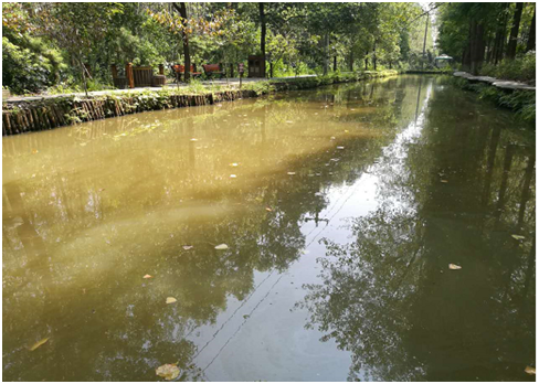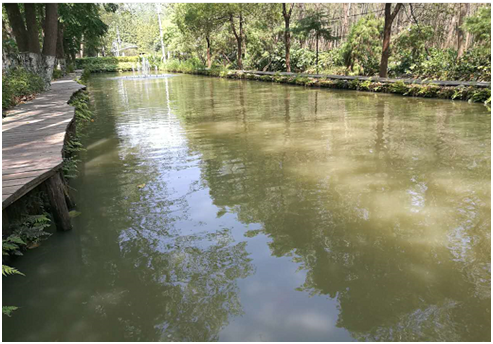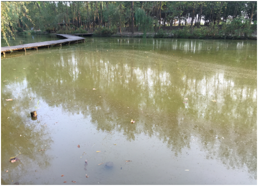 1號(hào)水域:位于焦姥路北,翠隱洞天東,長130米,均寬8米水域,面積1.62畝,1號(hào)水域相對(duì)獨(dú)立,補(bǔ)水由噴泉引地下水補(bǔ)充,水深1.5米,水體發(fā)黑,富營養(yǎng)化嚴(yán)重,透明度低;2號(hào)水域:位于茗舍聽見附近,水域相對(duì)獨(dú)立,面積0.84畝,水深1.5米,水面飄浮厚厚的藻類水華,水生態(tài)嚴(yán)重缺失,水色呈黃色,補(bǔ)水由地下水補(bǔ)充;