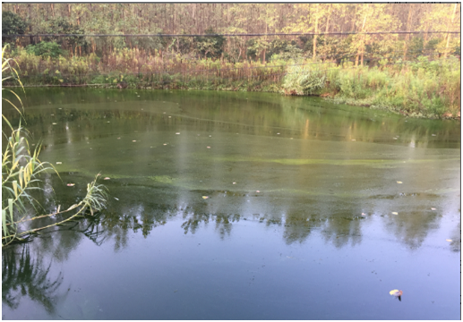 3號(hào)水域: 位于彩林站附近,水域與其他水域連通,水流量較小,水深1.5米,長100米,均寬20米,面積9.94畝。污染嚴(yán)重,水生態(tài)缺失,水色呈深綠色,透明度極低,水面飄浮大量油狀水華物質(zhì)。